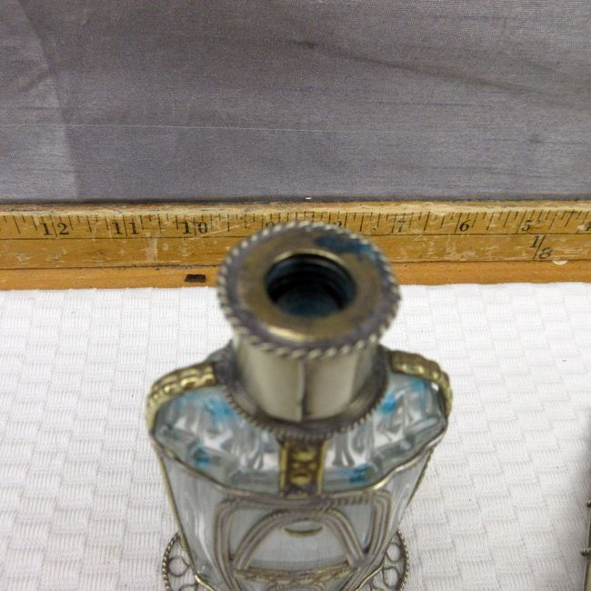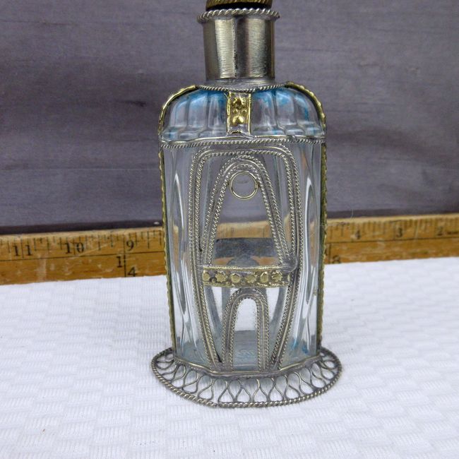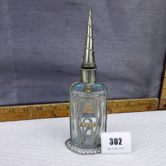 Current Bid: $46.44 [Refresh Price]YOU WILL NEED TO REFRESH THIS PAGE TO SEE UPDATED BID (Log in and this will update automatically) You must LOG IN or REGISTER to see this full page auction listing and bid. Auction is Over Winning Bid Amount: $46.44 **Lot Details: (302o) - Vintage Moroccan perfume bottle. Clear glass with mixed metal overlay (pewter? silver?). Looks like pour spout is brass. Beautiful piece Log in to add this lot to your watch list or place a bid |
