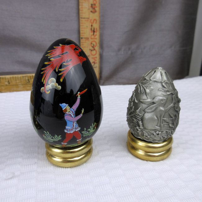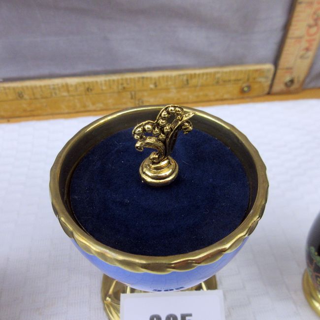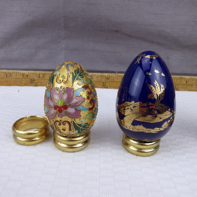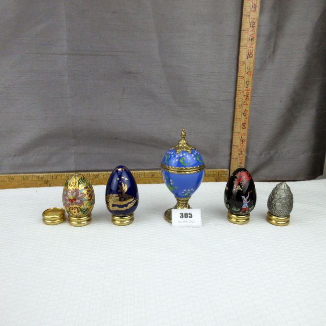 Current Bid: $17.22 [Refresh Price]YOU WILL NEED TO REFRESH THIS PAGE TO SEE UPDATED BID (Log in and this will update automatically) You must LOG IN or REGISTER to see this full page auction listing and bid. Auction is Over Winning Bid Amount: $17.22 **Lot Details: (305o) - Ornamental egg collection. Includes one solid pewter, one musical, one multi coloured with gold, one black, one navy, has hairline crack but still pretty to display, with stands for all Log in to add this lot to your watch list or place a bid |