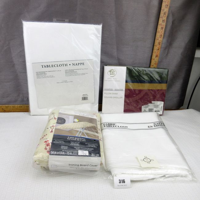 Current Bid: $13.00 [Refresh Price]YOU WILL NEED TO REFRESH THIS PAGE TO SEE UPDATED BID (Log in and this will update automatically) You must LOG IN or REGISTER to see this full page auction listing and bid. Auction is Over Winning Bid Amount: $13.00 **Lot Details: (316o) - Linen lot. Ironing board cover, 61x76 CK pillow sham, 60" round permanent press white tablecloth, 70" round permanent press tablecloth Log in to add this lot to your watch list or place a bid |