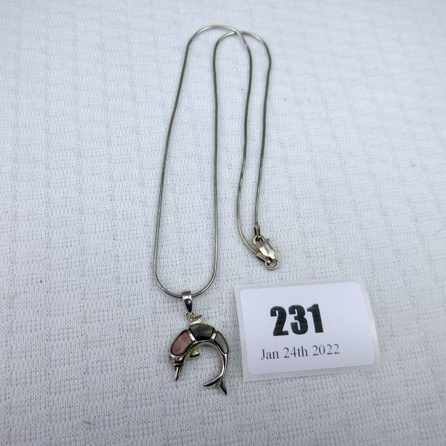 Current Bid: $5.00 [Refresh Price]YOU WILL NEED TO REFRESH THIS PAGE TO SEE UPDATED BID (Log in and this will update automatically) You must LOG IN or REGISTER to see this full page auction listing and bid. Auction is Over Winning Bid Amount: $5.00 **Lot Details: (231q) - Sterling Silver Dolphin Pendant stones unknown, markers initials on 18" round Omega Chain w lobster claw closure Log in to add this lot to your watch list or place a bid |