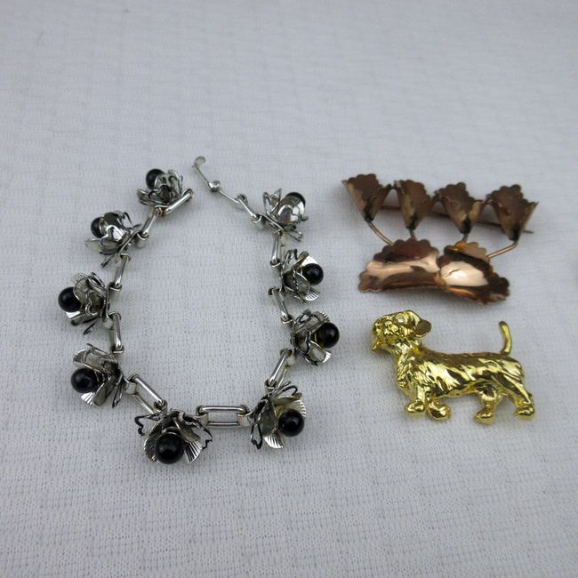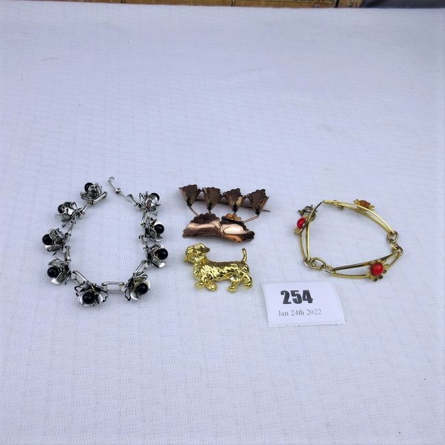 Current Bid: $[Refresh Price]YOU WILL NEED TO REFRESH THIS PAGE TO SEE UPDATED BID (Log in and this will update automatically) You must LOG IN or REGISTER to see this full page auction listing and bid. Auction is Over Winning Bid Amount: $This item did not sell **Lot Details: (254q) - 4 pcs, JJ signed Wagging Puppy Brooch, Unique Copper Brooch, Flower black stone Bracelet and really nice red stoned Flower Bracelet Log in to add this lot to your watch list or place a bid |