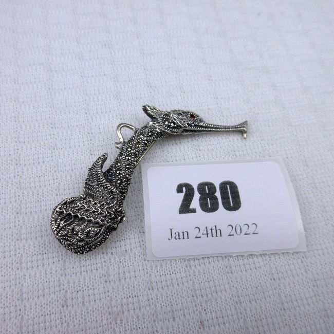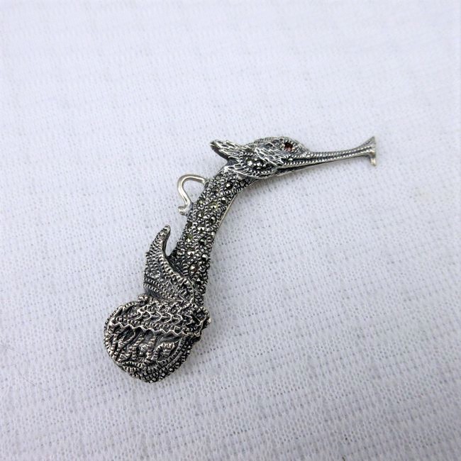 Current Bid: $13.05 [Refresh Price]YOU WILL NEED TO REFRESH THIS PAGE TO SEE UPDATED BID (Log in and this will update automatically) You must LOG IN or REGISTER to see this full page auction listing and bid. Auction is Over Winning Bid Amount: $13.05 **Lot Details: (280q) - 2 1/2" Sterling Marcasite SeaHorse Pendant/Brooch w faceted amber colour rhinestone eye ! Log in to add this lot to your watch list or place a bid |