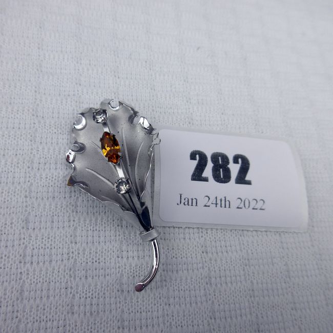Current Bid: $7.00 [Refresh Price]YOU WILL NEED TO REFRESH THIS PAGE TO SEE UPDATED BID (Log in and this will update automatically) You must LOG IN or REGISTER to see this full page auction listing and bid. Auction is Over Winning Bid Amount: $7.00 **Lot Details: (282q) - 2" Bond Boyd Sterling brushed silver orange amber crystal highlight this Flower Brooch Log in to add this lot to your watch list or place a bid |