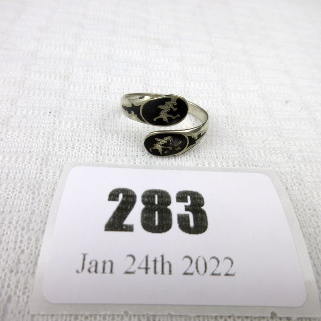Current Bid: $5.00 [Refresh Price]YOU WILL NEED TO REFRESH THIS PAGE TO SEE UPDATED BID (Log in and this will update automatically) You must LOG IN or REGISTER to see this full page auction listing and bid. Auction is Over Winning Bid Amount: $5.00 **Lot Details: (283q) - Siam Sterling Niello double wrap Ring Log in to add this lot to your watch list or place a bid |