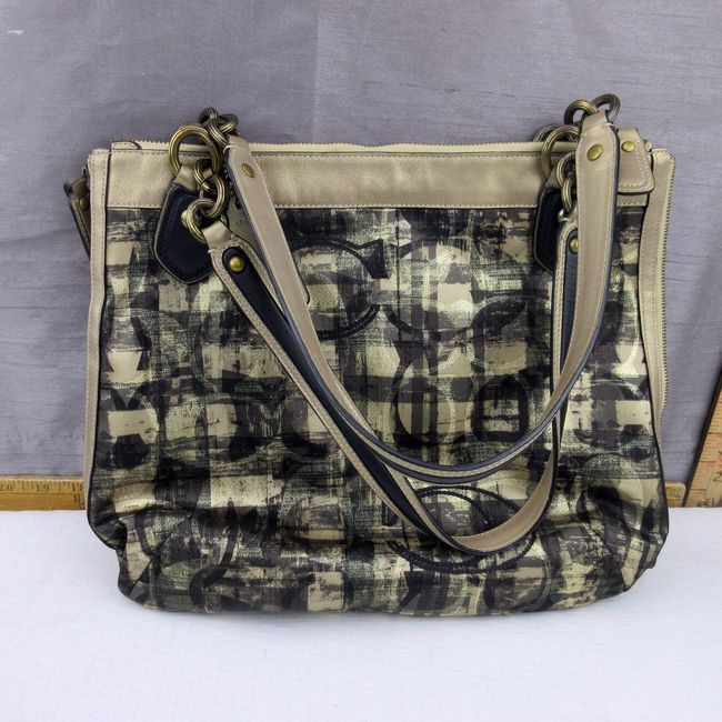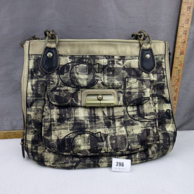 Current Bid: $37.50 [Refresh Price]YOU WILL NEED TO REFRESH THIS PAGE TO SEE UPDATED BID (Log in and this will update automatically) You must LOG IN or REGISTER to see this full page auction listing and bid. Auction is Over Winning Bid Amount: $37.50 **Lot Details: (296q) - Hard to Find, Coach Kristin plaid Sig C Metallic Gold Black Handbag with Coach Hang Tags, barely used, water resistant and stain resistant, sold out everywhere ! Log in to add this lot to your watch list or place a bid |