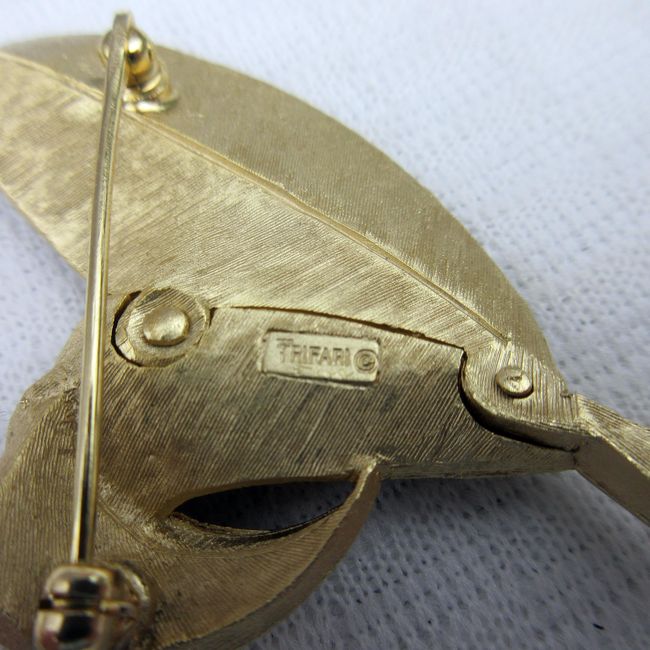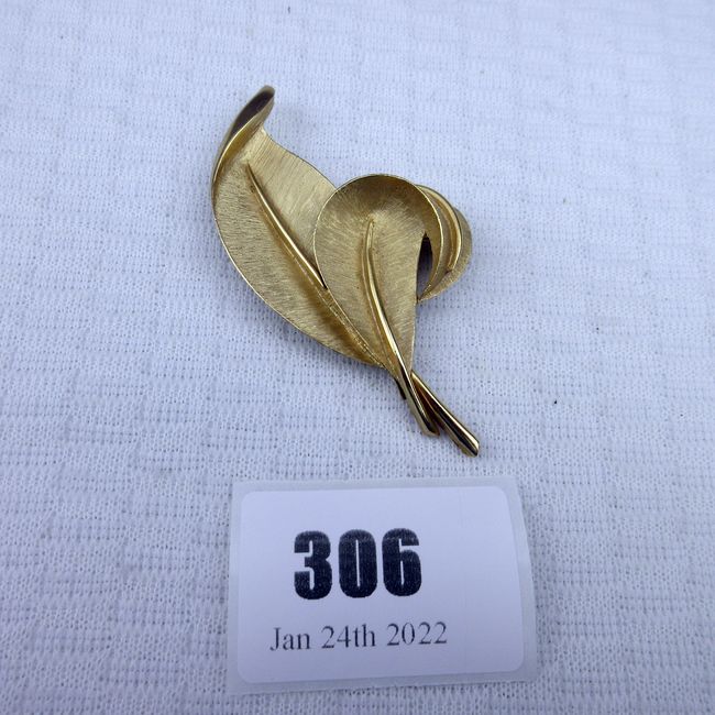 Current Bid: $5.00 [Refresh Price]YOU WILL NEED TO REFRESH THIS PAGE TO SEE UPDATED BID (Log in and this will update automatically) You must LOG IN or REGISTER to see this full page auction listing and bid. Auction is Over Winning Bid Amount: $5.00 **Lot Details: (306q) - Marked Trifari leaf brooch, 3" length Log in to add this lot to your watch list or place a bid |