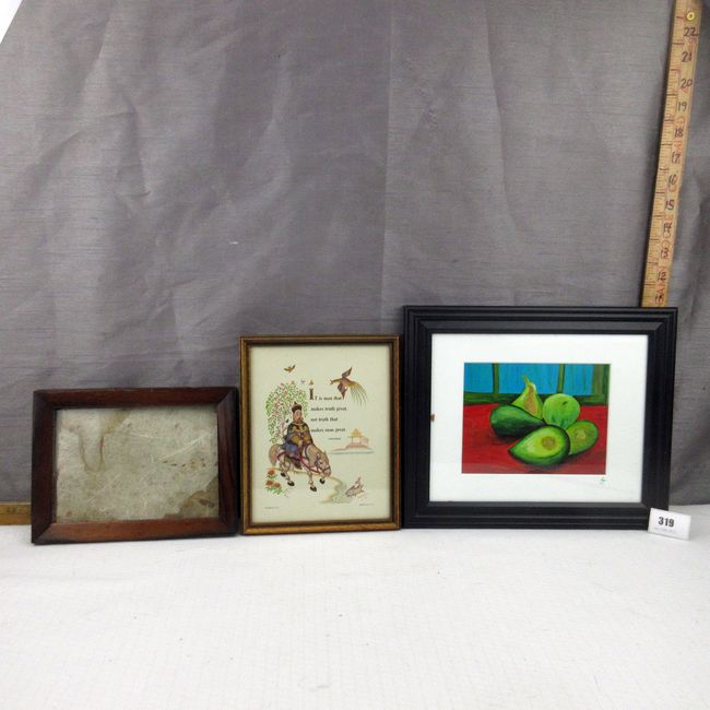 Current Bid: $[Refresh Price]YOU WILL NEED TO REFRESH THIS PAGE TO SEE UPDATED BID (Log in and this will update automatically) You must LOG IN or REGISTER to see this full page auction listing and bid. Auction is Over Winning Bid Amount: $This item did not sell **Lot Details: (319q) - Casa Linda paining of Avocados 10" x 12" including frame. Confucius vintage USA saying 7" x 8 1/2", nice Walnut frame 6 1/2" x 8 1/2" Log in to add this lot to your watch list or place a bid |