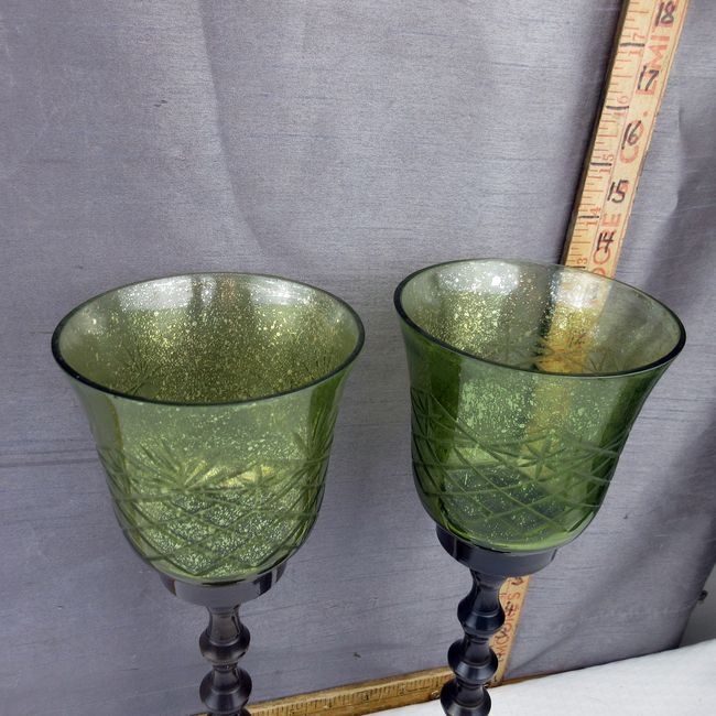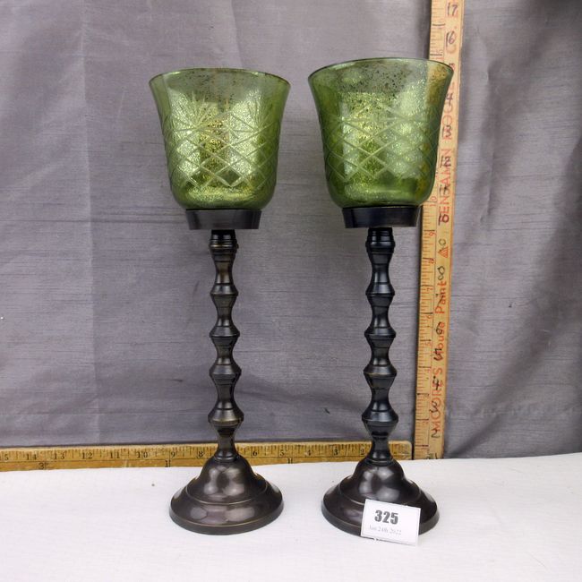 Current Bid: $7.00 [Refresh Price]YOU WILL NEED TO REFRESH THIS PAGE TO SEE UPDATED BID (Log in and this will update automatically) You must LOG IN or REGISTER to see this full page auction listing and bid. Auction is Over Winning Bid Amount: $7.00 **Lot Details: (325q) - A pair of bronze stemmed with etched green vase candle holders, 13"H Log in to add this lot to your watch list or place a bid |