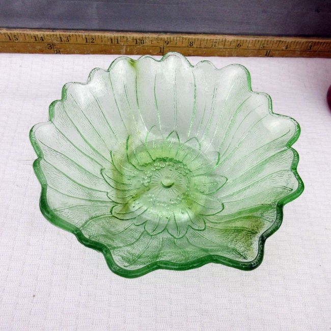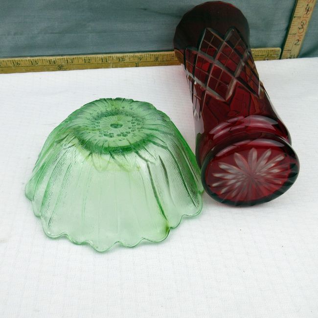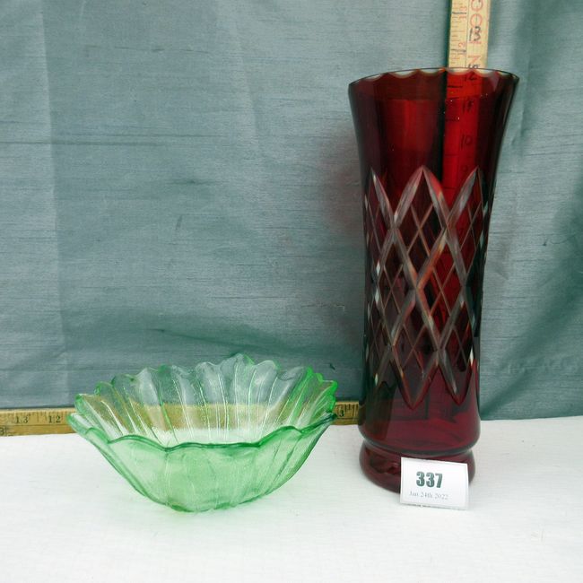 Current Bid: $17.55 [Refresh Price]YOU WILL NEED TO REFRESH THIS PAGE TO SEE UPDATED BID (Log in and this will update automatically) You must LOG IN or REGISTER to see this full page auction listing and bid. Auction is Over Winning Bid Amount: $17.55 **Lot Details: (337q) - A vintage red etched glass vase and a Lily Pons green depression glass bowl with a scalloped edge, embossed flower and leaf petal design. Excellent condition Log in to add this lot to your watch list or place a bid |