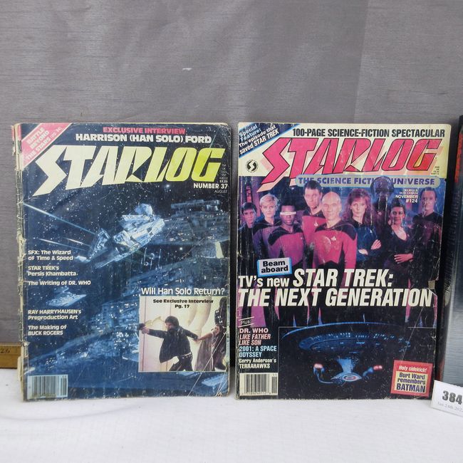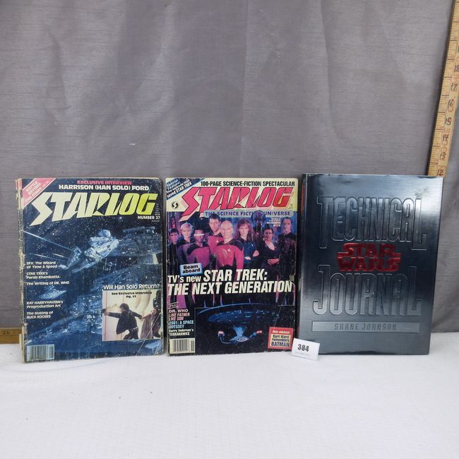 Current Bid: $5.00 [Refresh Price]YOU WILL NEED TO REFRESH THIS PAGE TO SEE UPDATED BID (Log in and this will update automatically) You must LOG IN or REGISTER to see this full page auction listing and bid. Auction is Over Winning Bid Amount: $5.00 **Lot Details: (384q) - First edition with dust jacket Technical Star Wars Journal. In depth look at the many varied elements of Star Wars. Star Log magazines, 2 rare finds included in this lot. In vintage condition #37 featuring Harrison Ford and #124 Log in to add this lot to your watch list or place a bid |