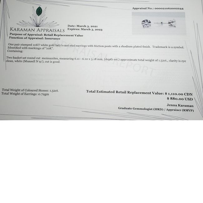 Current Bid: $67.00 [Refresh Price]YOU WILL NEED TO REFRESH THIS PAGE TO SEE UPDATED BID (Log in and this will update automatically) You must LOG IN or REGISTER to see this full page auction listing and bid. Auction is Over Winning Bid Amount: $67.00 **Lot Details: (JS131108) - 10K White Gold White Moissainite(1.52ct) Earrings (~weight 0.72g), Made in Canada, Appraised Retail $400 Log in to add this lot to your watch list or place a bid |