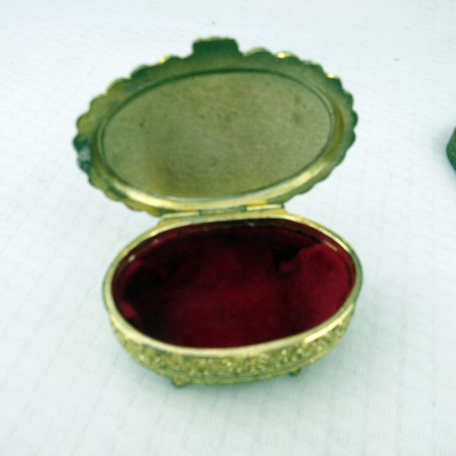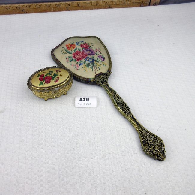 Current Bid: $5.00 [Refresh Price]YOU WILL NEED TO REFRESH THIS PAGE TO SEE UPDATED BID (Log in and this will update automatically) You must LOG IN or REGISTER to see this full page auction listing and bid. Auction is Over Winning Bid Amount: $5.00 **Lot Details: (420q) - Hand held vintage vanity mirror, ornate brass. Handle slightly warped. Japanese vintage trinket box Log in to add this lot to your watch list or place a bid |