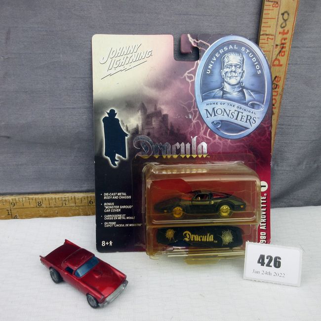 Current Bid: $22.00 [Refresh Price]YOU WILL NEED TO REFRESH THIS PAGE TO SEE UPDATED BID (Log in and this will update automatically) You must LOG IN or REGISTER to see this full page auction listing and bid. Auction is Over Winning Bid Amount: $22.00 **Lot Details: (426q) - Johnny Lightning Dracula 198 Aerovette #1, 1957 Hot Wheels T-Bird, made in Hong Kong, made in 1977 Log in to add this lot to your watch list or place a bid |