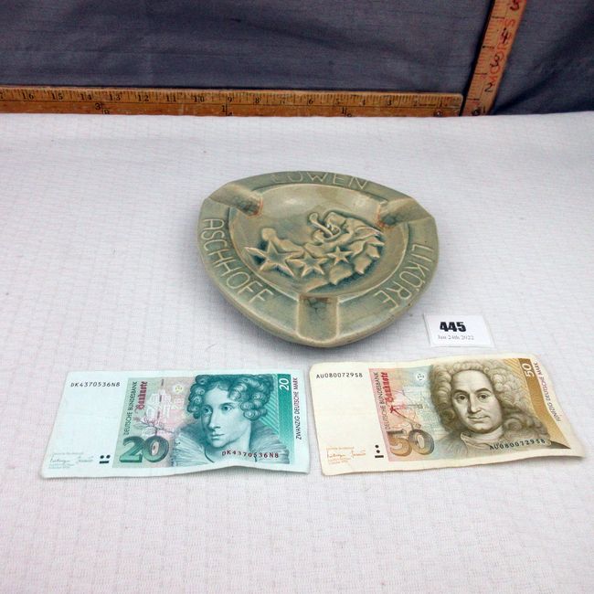 Current Bid: $5.00 [Refresh Price]YOU WILL NEED TO REFRESH THIS PAGE TO SEE UPDATED BID (Log in and this will update automatically) You must LOG IN or REGISTER to see this full page auction listing and bid. Auction is Over Winning Bid Amount: $5.00 **Lot Details: (445q) - Kanuf-Keramik Itterseach Co German ashtray, 70 Deutsch Marks Log in to add this lot to your watch list or place a bid |