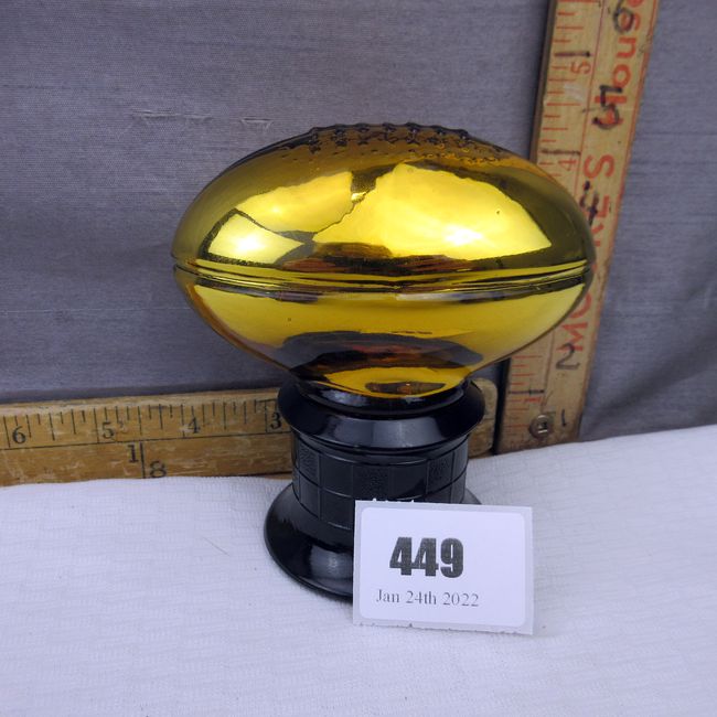 Current Bid: $175.00 [Refresh Price]YOU WILL NEED TO REFRESH THIS PAGE TO SEE UPDATED BID (Log in and this will update automatically) You must LOG IN or REGISTER to see this full page auction listing and bid. Auction is Over Winning Bid Amount: $175.00 **Lot Details: (449q) - Extremely rare mercury coated glass football manufactured by Chas. F. Zeller Log in to add this lot to your watch list or place a bid |