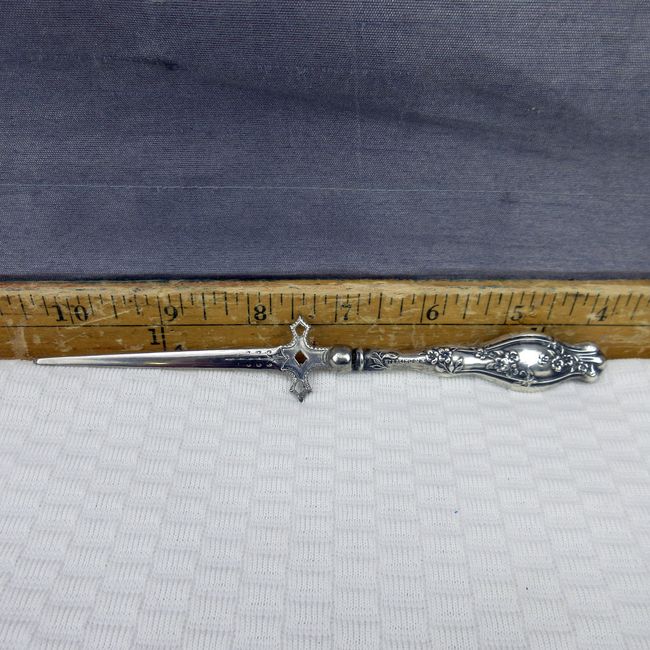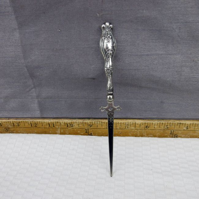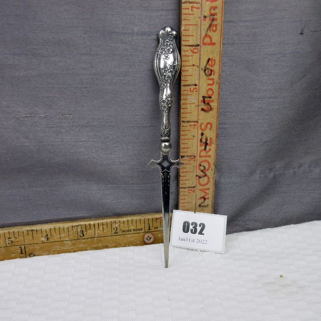 Current Bid: $34.00 [Refresh Price]YOU WILL NEED TO REFRESH THIS PAGE TO SEE UPDATED BID (Log in and this will update automatically) You must LOG IN or REGISTER to see this full page auction listing and bid. Auction is Over Winning Bid Amount: $34.00 **Lot Details: (32r) - Dagger shaped Victorian letter opener, marked sterliung Log in to add this lot to your watch list or place a bid |
