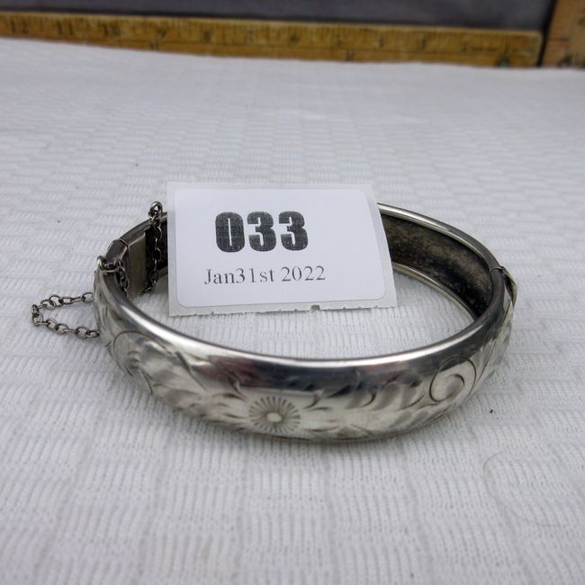 Current Bid: $32.00 [Refresh Price]YOU WILL NEED TO REFRESH THIS PAGE TO SEE UPDATED BID (Log in and this will update automatically) You must LOG IN or REGISTER to see this full page auction listing and bid. Auction is Over Winning Bid Amount: $32.00 **Lot Details: (33r) - Engraved Victorian bracelet marked sterling, good condition Log in to add this lot to your watch list or place a bid |
