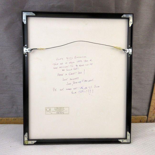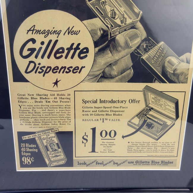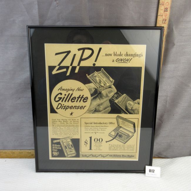 Current Bid: $7.00 [Refresh Price]YOU WILL NEED TO REFRESH THIS PAGE TO SEE UPDATED BID (Log in and this will update automatically) You must LOG IN or REGISTER to see this full page auction listing and bid. Auction is Over Winning Bid Amount: $7.00 **Lot Details: (12h) - Very nicely framed and matted 1948 Gillette razor blade advert. Has a nice black and white classic look to it. I don't have to tell you where I think it should hang. Hipster gold 13" x 16" Log in to add this lot to your watch list or place a bid |