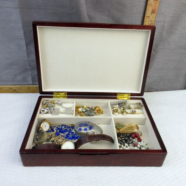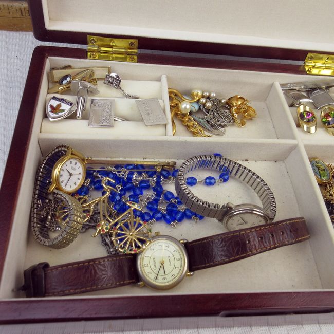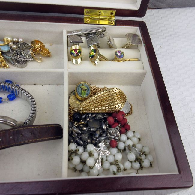 Current Bid: $7.00 [Refresh Price]YOU WILL NEED TO REFRESH THIS PAGE TO SEE UPDATED BID (Log in and this will update automatically) You must LOG IN or REGISTER to see this full page auction listing and bid. Auction is Over Winning Bid Amount: $7.00 **Lot Details: (46h) - Gentlemens Ladies Jewelry Dresser Box with a pair Sterling Silver Cufflinks 1 pair with mystic stones and matching tie pin plus more cufflinks sets plus, watches require batteries, earrings, pendants, marcasite pearls brooch, religious rosaries, Log in to add this lot to your watch list or place a bid |
