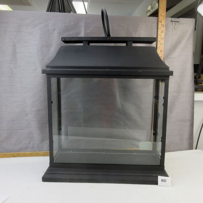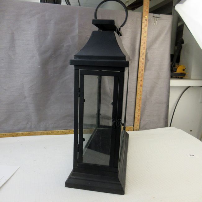 Current Bid: $23.00 [Refresh Price]YOU WILL NEED TO REFRESH THIS PAGE TO SEE UPDATED BID (Log in and this will update automatically) You must LOG IN or REGISTER to see this full page auction listing and bid. Auction is Over Winning Bid Amount: $23.00 **Lot Details: (47h) - Glass black Metal single door Top Vent Patio Citronella Candle Lantern Light, 15 3/4" wide x 23" high incl handle x 7" deep (base) 5+" interior dimension Log in to add this lot to your watch list or place a bid |