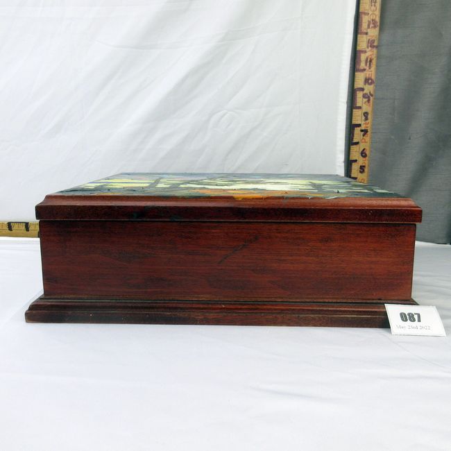 Current Bid: $137.05 [Refresh Price]YOU WILL NEED TO REFRESH THIS PAGE TO SEE UPDATED BID (Log in and this will update automatically) You must LOG IN or REGISTER to see this full page auction listing and bid. Auction is Over Winning Bid Amount: $137.05 **Lot Details: (87h) - Hand-crafted cherry wood box with brass handles, with original oil painting by Michael Scott depicting a Muskoka landscape. Signed lower right, 14” W. Log in to add this lot to your watch list or place a bid |
