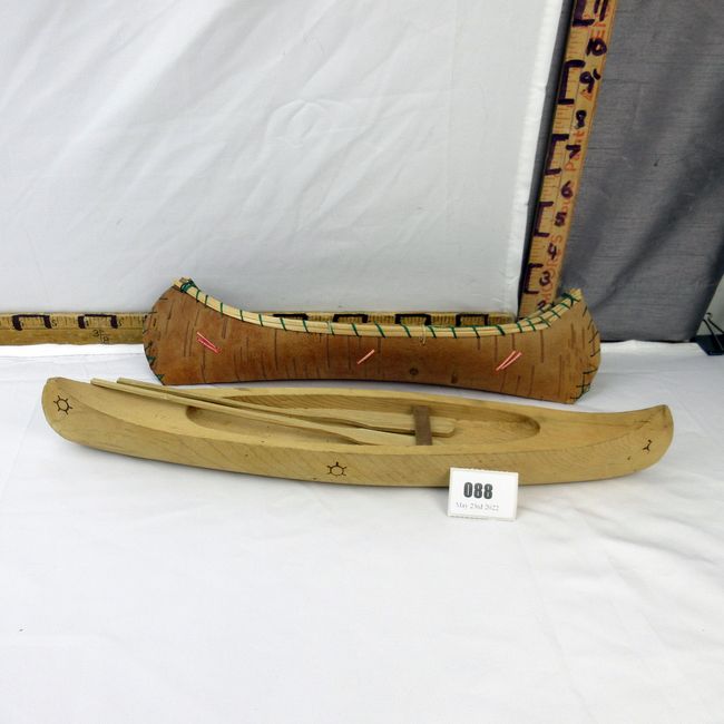Current Bid: $17.02 [Refresh Price]YOU WILL NEED TO REFRESH THIS PAGE TO SEE UPDATED BID (Log in and this will update automatically) You must LOG IN or REGISTER to see this full page auction listing and bid. Auction is Over Winning Bid Amount: $17.02 **Lot Details: (88h) - Two vintage First Nations canoes, including one birchbark w/ quillwork details and the other, carved cedar marked “Ojibwe Arts CANADA” 15” L Log in to add this lot to your watch list or place a bid |