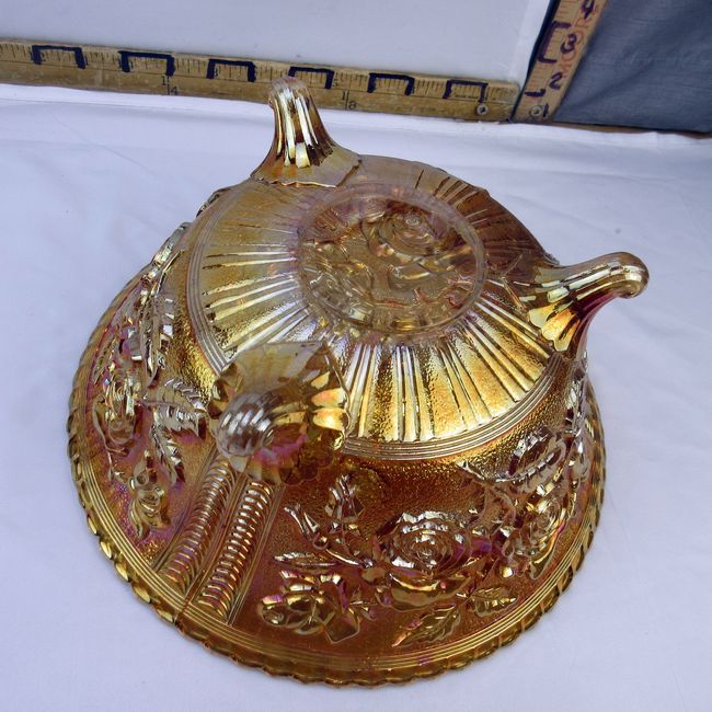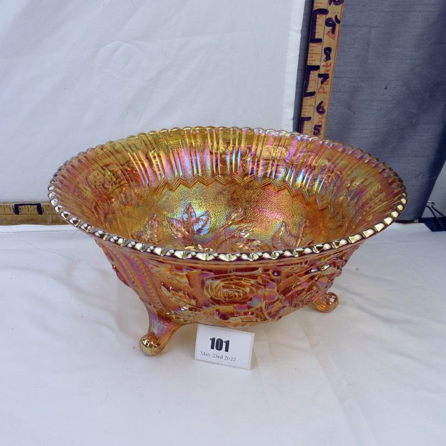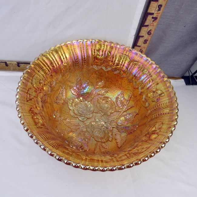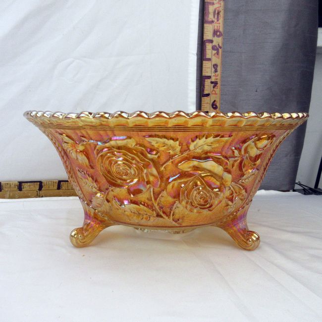 Current Bid: $7.00 [Refresh Price]YOU WILL NEED TO REFRESH THIS PAGE TO SEE UPDATED BID (Log in and this will update automatically) You must LOG IN or REGISTER to see this full page auction listing and bid. Auction is Over Winning Bid Amount: $7.00 **Lot Details: (101h) - Vintage Imperial iridescent marigold Rose patter footed bowl, one chip to the underside rim which cannot been seen when displayed. 10” W Log in to add this lot to your watch list or place a bid |