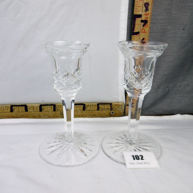 Current Bid: $5.00 [Refresh Price]YOU WILL NEED TO REFRESH THIS PAGE TO SEE UPDATED BID (Log in and this will update automatically) You must LOG IN or REGISTER to see this full page auction listing and bid. Auction is Over Winning Bid Amount: $5.00 **Lot Details: (102h) - Pair Waterford cut crystal candle holders in the Lismore design, both stamped and in mint condition. 5 ½” H each. Log in to add this lot to your watch list or place a bid |