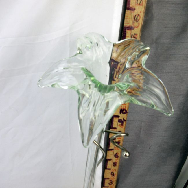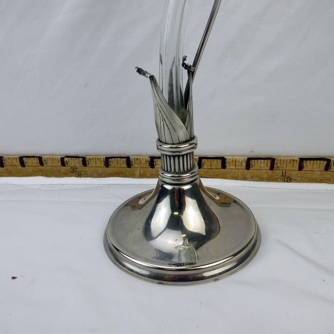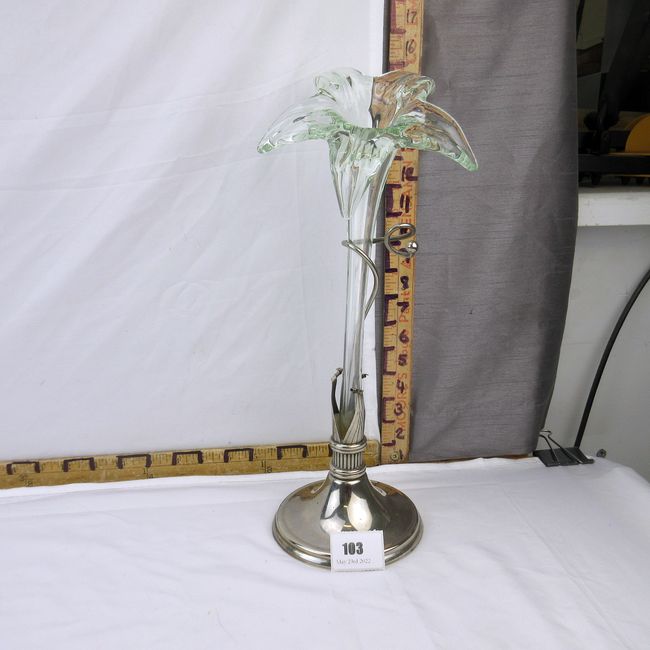 Current Bid: $17.00 [Refresh Price]YOU WILL NEED TO REFRESH THIS PAGE TO SEE UPDATED BID (Log in and this will update automatically) You must LOG IN or REGISTER to see this full page auction listing and bid. Auction is Over Winning Bid Amount: $17.00 **Lot Details: (103h) - Vintage Art Nouveau style centrepiece vase featuring a tall hand-blown glass Lilly, raised on a white metal base, no marks. 15” H, excellent condition. Log in to add this lot to your watch list or place a bid |