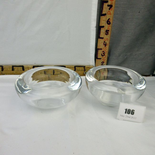 Current Bid: $[Refresh Price]YOU WILL NEED TO REFRESH THIS PAGE TO SEE UPDATED BID (Log in and this will update automatically) You must LOG IN or REGISTER to see this full page auction listing and bid. Auction is Over Winning Bid Amount: $This item did not sell **Lot Details: (106h) - Two (2) mid-century Orrefors Sweden crystal pin bowls, larger is 4 ½” W; both with minor nicks to base edge. Marked “Orrefors”. Log in to add this lot to your watch list or place a bid |