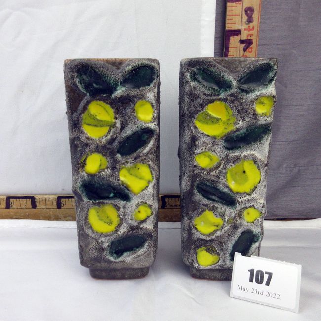 Current Bid: $14.75 [Refresh Price]YOU WILL NEED TO REFRESH THIS PAGE TO SEE UPDATED BID (Log in and this will update automatically) You must LOG IN or REGISTER to see this full page auction listing and bid. Auction is Over Winning Bid Amount: $14.75 **Lot Details: (107h) - Pair Mid-century Modern Strehla (Germany) pottery vases, each marked “1224/2”, 6 ¼” H. Log in to add this lot to your watch list or place a bid |