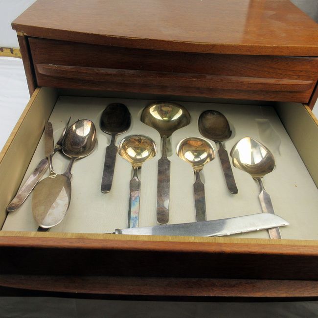 Current Bid: $200.00 [Refresh Price]YOU WILL NEED TO REFRESH THIS PAGE TO SEE UPDATED BID (Log in and this will update automatically) You must LOG IN or REGISTER to see this full page auction listing and bid. Auction is Over Winning Bid Amount: $200.00 **Lot Details: (109h) - Huge mid-century modern Flatware set by Gerritsen & Van Kempen (Holland), housed in the original 1960s teak flatware case. Log in to add this lot to your watch list or place a bid |