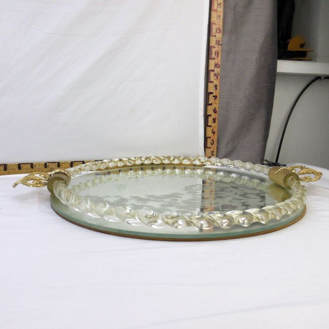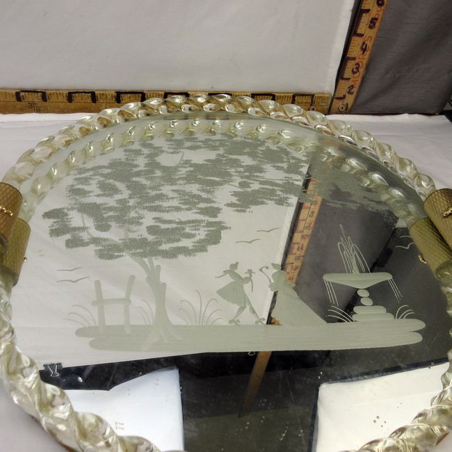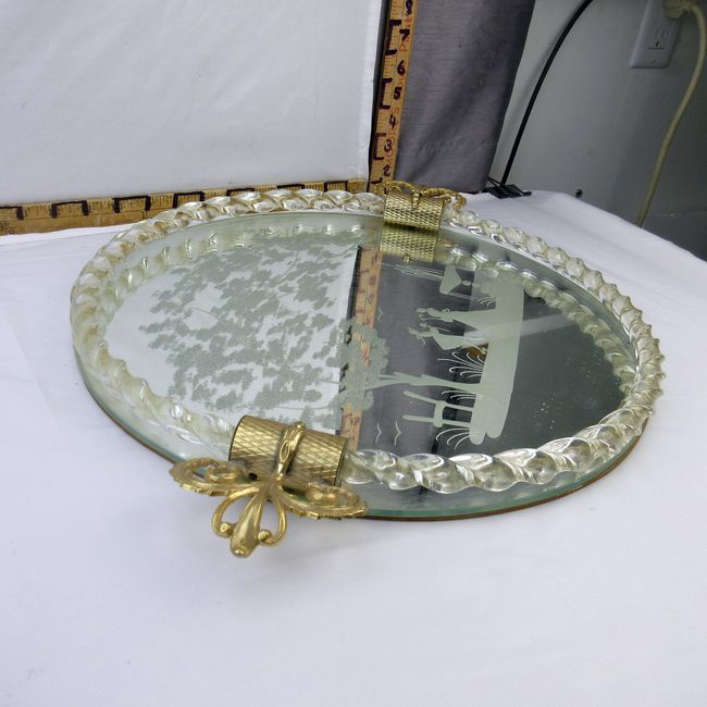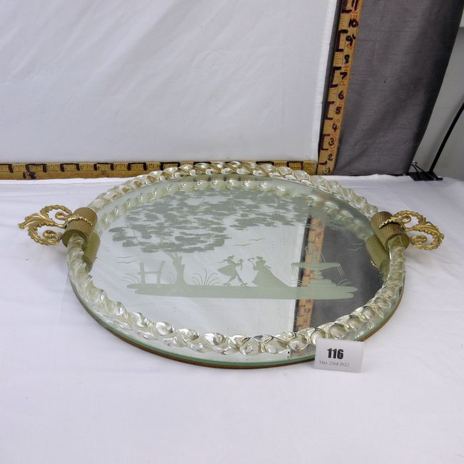 Current Bid: $32.00 [Refresh Price]YOU WILL NEED TO REFRESH THIS PAGE TO SEE UPDATED BID (Log in and this will update automatically) You must LOG IN or REGISTER to see this full page auction listing and bid. Auction is Over Winning Bid Amount: $32.00 **Lot Details: (116h) - Vintage 1930s Art Deco Italian vanity mirror tray, with etched courting couple and twisted Murano glass gallery with gold flecks, excellent condition. 20 ½” W Log in to add this lot to your watch list or place a bid |