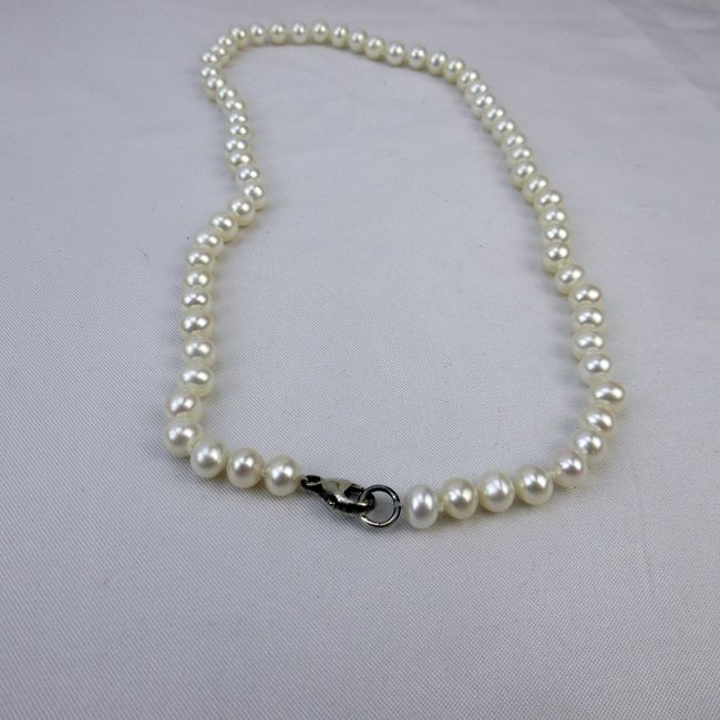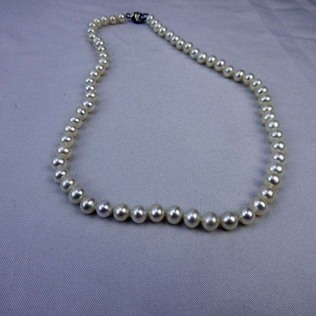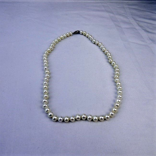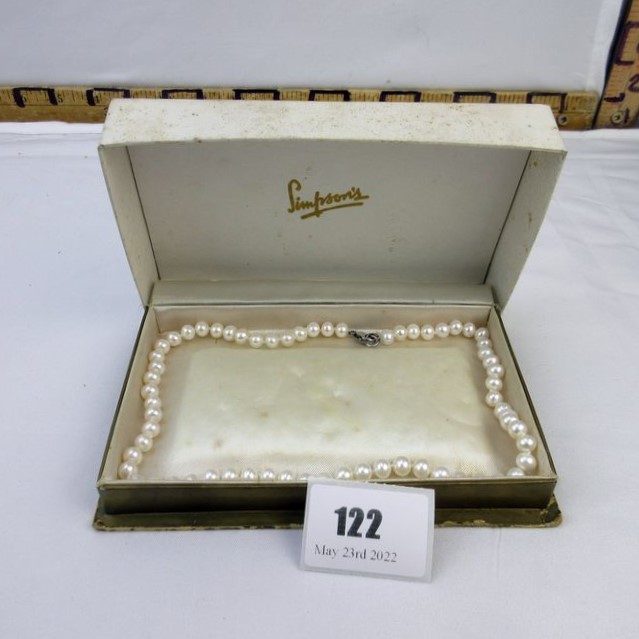 Current Bid: $37.00 [Refresh Price]YOU WILL NEED TO REFRESH THIS PAGE TO SEE UPDATED BID (Log in and this will update automatically) You must LOG IN or REGISTER to see this full page auction listing and bid. Auction is Over Winning Bid Amount: $37.00 **Lot Details: (122h) - Vintage genuine round white freshwater pearl necklace with a sterling lobster clasp; comes in old Simpson’s box. 18” L Log in to add this lot to your watch list or place a bid |