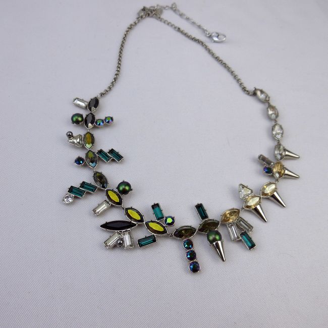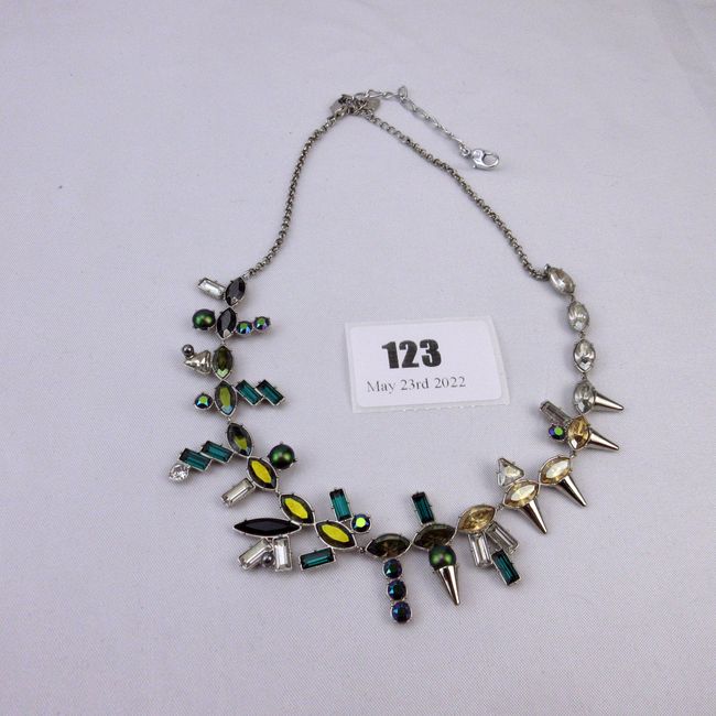 Current Bid: $38.00 [Refresh Price]YOU WILL NEED TO REFRESH THIS PAGE TO SEE UPDATED BID (Log in and this will update automatically) You must LOG IN or REGISTER to see this full page auction listing and bid. Auction is Over Winning Bid Amount: $38.00 **Lot Details: (123h) - Estate Swarovski crystal rhinestone Necklace with Modernist asymmetrical design. Log in to add this lot to your watch list or place a bid |