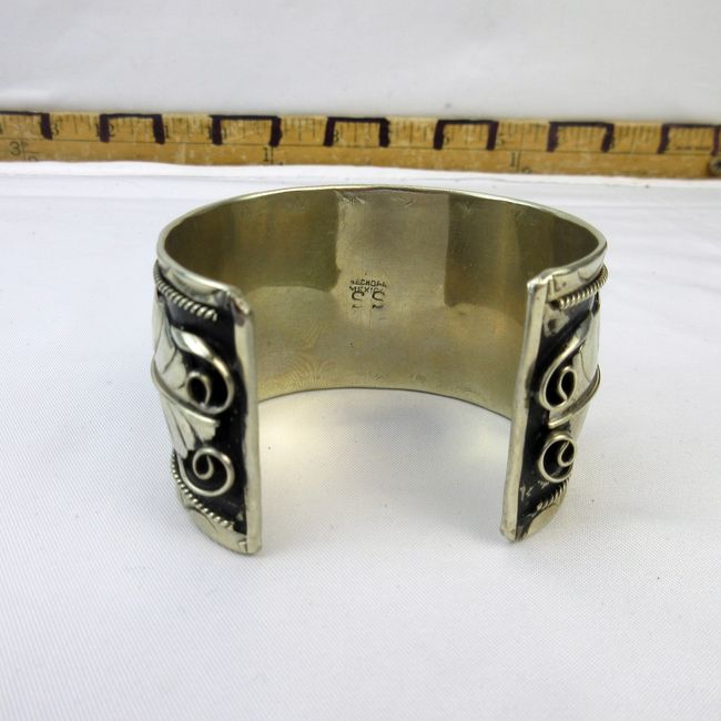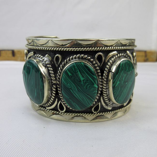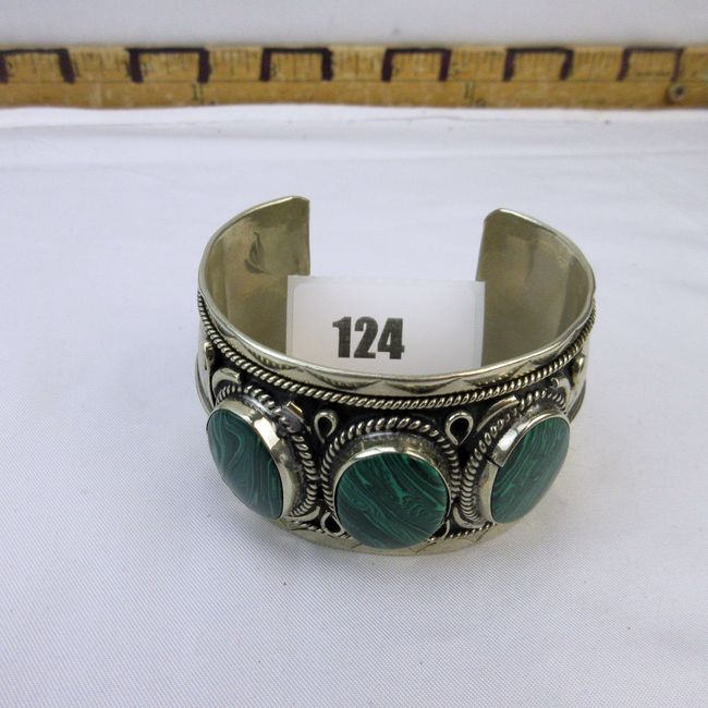 Current Bid: $43.00 [Refresh Price]YOU WILL NEED TO REFRESH THIS PAGE TO SEE UPDATED BID (Log in and this will update automatically) You must LOG IN or REGISTER to see this full page auction listing and bid. Auction is Over Winning Bid Amount: $43.00 **Lot Details: (124h) - Vintage Mexican sterling silver Cuff Bracelet with malachite stones; 77 grams. Log in to add this lot to your watch list or place a bid |