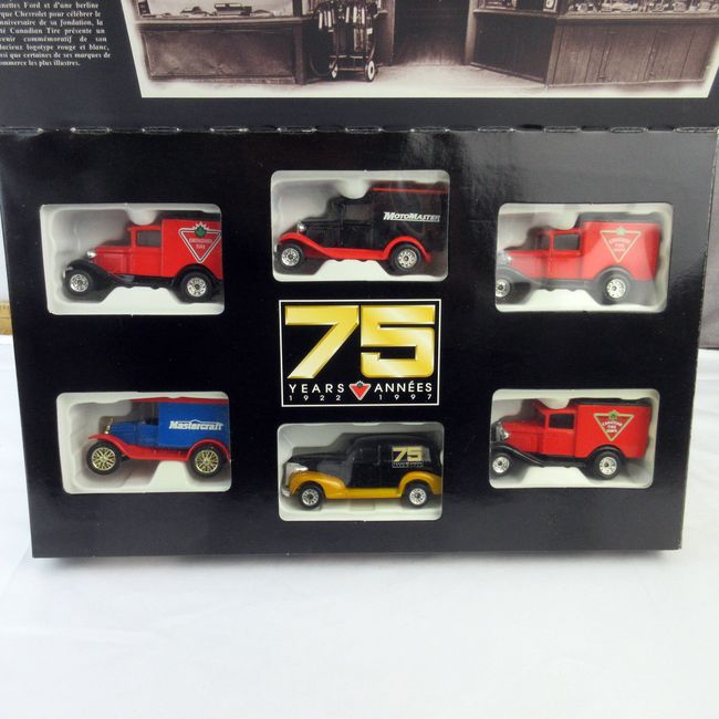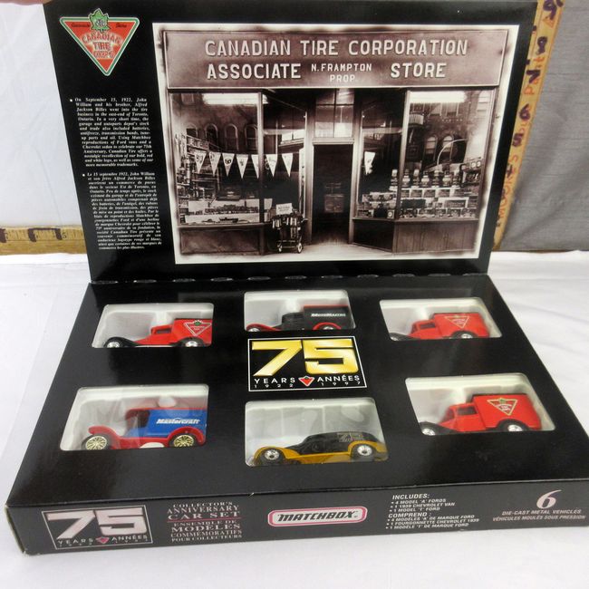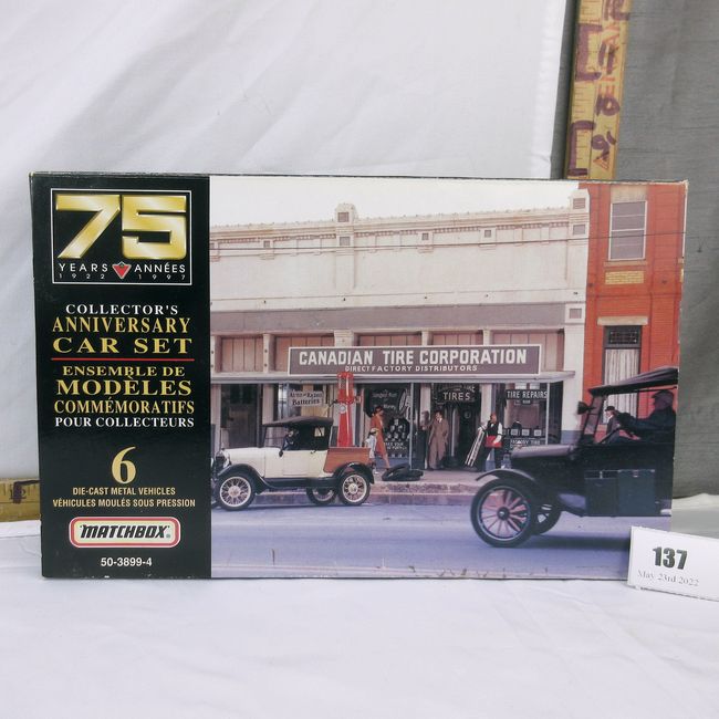 Current Bid: $27.00 [Refresh Price]YOU WILL NEED TO REFRESH THIS PAGE TO SEE UPDATED BID (Log in and this will update automatically) You must LOG IN or REGISTER to see this full page auction listing and bid. Auction is Over Winning Bid Amount: $27.00 **Lot Details: (137h) - Canadian Tire 75th Anniversary Collectors Car Set containing 6 Matchbox die cast metal vehicles. Set is complete, cars have never been touched; the package is in excellent condition. Log in to add this lot to your watch list or place a bid |