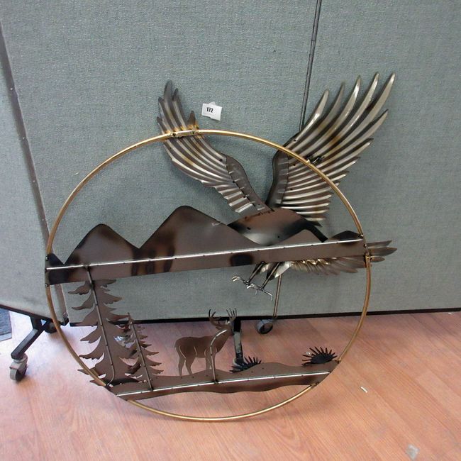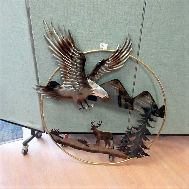Current Bid: $60.05 [Refresh Price]YOU WILL NEED TO REFRESH THIS PAGE TO SEE UPDATED BID (Log in and this will update automatically) You must LOG IN or REGISTER to see this full page auction listing and bid. Auction is Over Winning Bid Amount: $60.05 **Lot Details: (172h) - Stunning metal wall art with wall mount. Great colours and detail. Don't miss this one. Hunting Eagle 33.5" round Log in to add this lot to your watch list or place a bid |