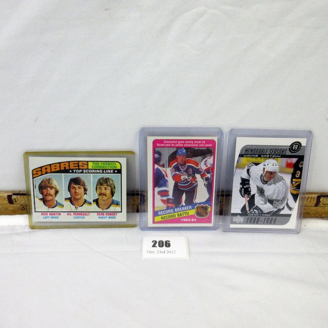 Current Bid: $5.00 [Refresh Price]YOU WILL NEED TO REFRESH THIS PAGE TO SEE UPDATED BID (Log in and this will update automatically) You must LOG IN or REGISTER to see this full page auction listing and bid. Auction is Over Winning Bid Amount: $5.00 **Lot Details: (206h) - 3 vintage hockey cards, 1976 French connection greats and 2 vintage Gretzky. All in NM/M condition. Look at the pictures Log in to add this lot to your watch list or place a bid |