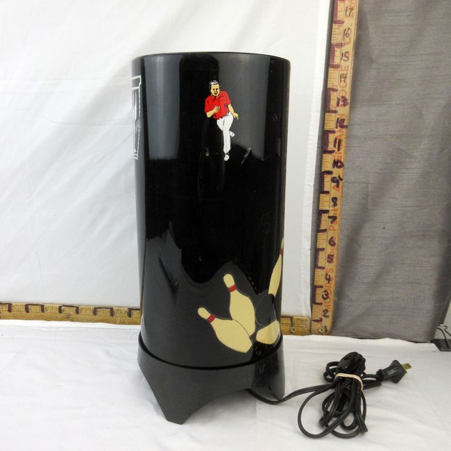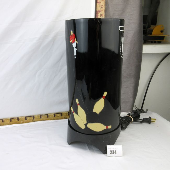 Current Bid: $96.00 [Refresh Price]YOU WILL NEED TO REFRESH THIS PAGE TO SEE UPDATED BID (Log in and this will update automatically) You must LOG IN or REGISTER to see this full page auction listing and bid. Auction is Over Winning Bid Amount: $96.00 **Lot Details: (234h) - A vintage magic spinning lamp, bowling theme. Awesome graphics, plug it in, let the bulb heat and watch it cast its cool shade. 13.5"H Log in to add this lot to your watch list or place a bid |