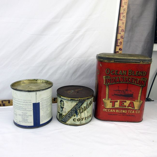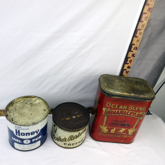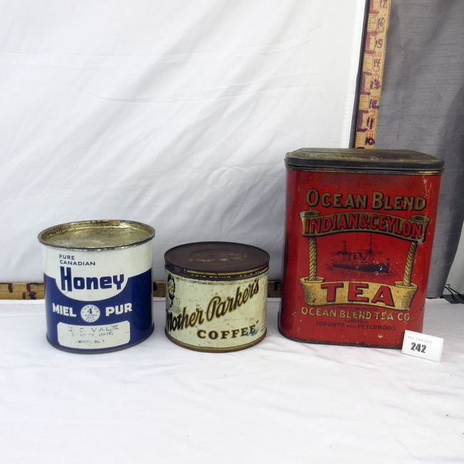 Current Bid: $13.11 [Refresh Price]YOU WILL NEED TO REFRESH THIS PAGE TO SEE UPDATED BID (Log in and this will update automatically) You must LOG IN or REGISTER to see this full page auction listing and bid. Auction is Over Winning Bid Amount: $13.11 **Lot Details: (242h) - Kitchen tin lot. Tea, coffee and honey, all are Canadian. The Ocean Blend is the hinged top large size of its 2 types Log in to add this lot to your watch list or place a bid |