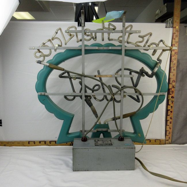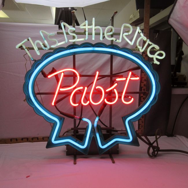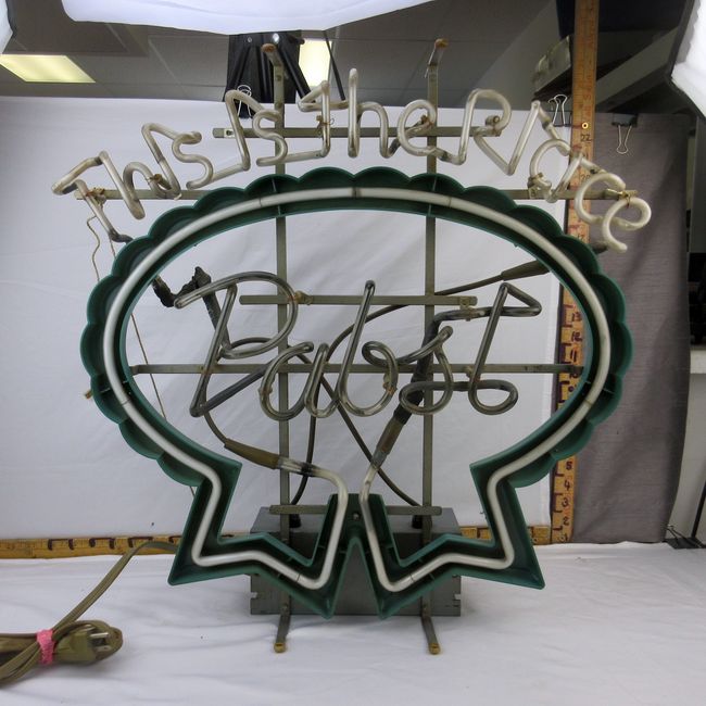 Current Bid: $178.00 [Refresh Price]YOU WILL NEED TO REFRESH THIS PAGE TO SEE UPDATED BID (Log in and this will update automatically) You must LOG IN or REGISTER to see this full page auction listing and bid. Auction is Over Winning Bid Amount: $178.00 **Lot Details: (255h) - One of my favourite beer sign neons, Pabst Blue Ribbon., This is the Place table top or hanging sign. Secure brackets on top and bottom for display choice. Marked Everbrite Electronics Signs, April 1983. It's a pretty awesome one. Approx 22" Log in to add this lot to your watch list or place a bid |