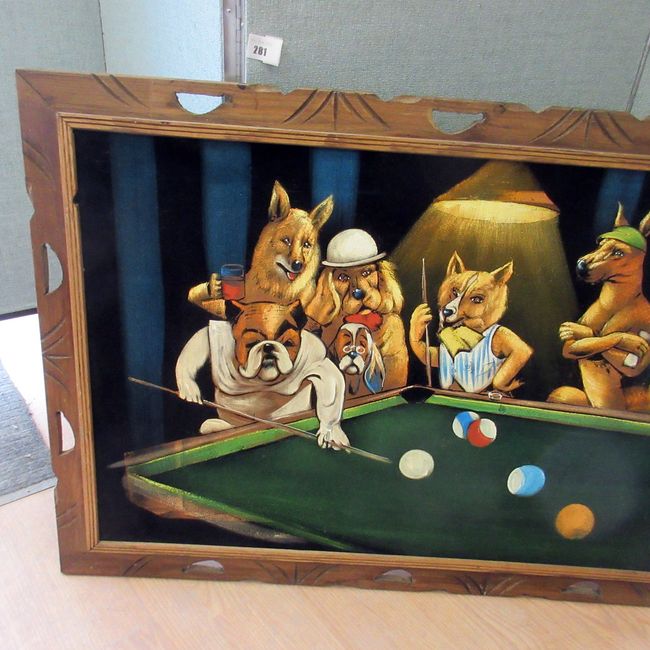Current Bid: $19.00 [Refresh Price]YOU WILL NEED TO REFRESH THIS PAGE TO SEE UPDATED BID (Log in and this will update automatically) You must LOG IN or REGISTER to see this full page auction listing and bid. Auction is Over Winning Bid Amount: $19.00 **Lot Details: (281h) - Vintage Retro era hand painted classic "Dogs playing pool" on black velvet in wood frame. This spectacular piece measures 28.25" x 40.5". A perfect work of art to display in the rumpus room, man cave or she shed. Log in to add this lot to your watch list or place a bid |