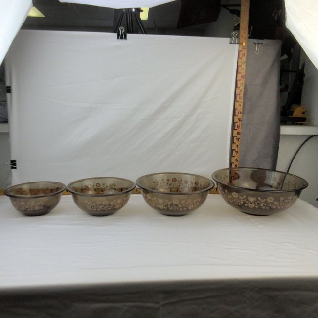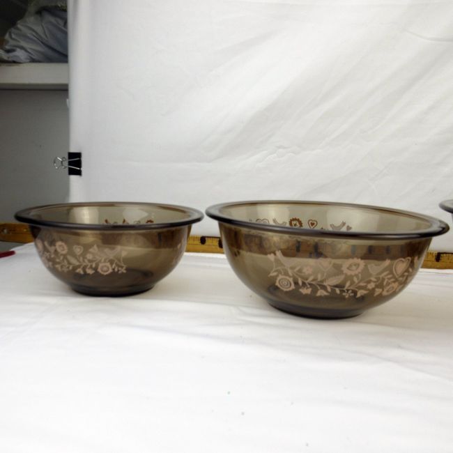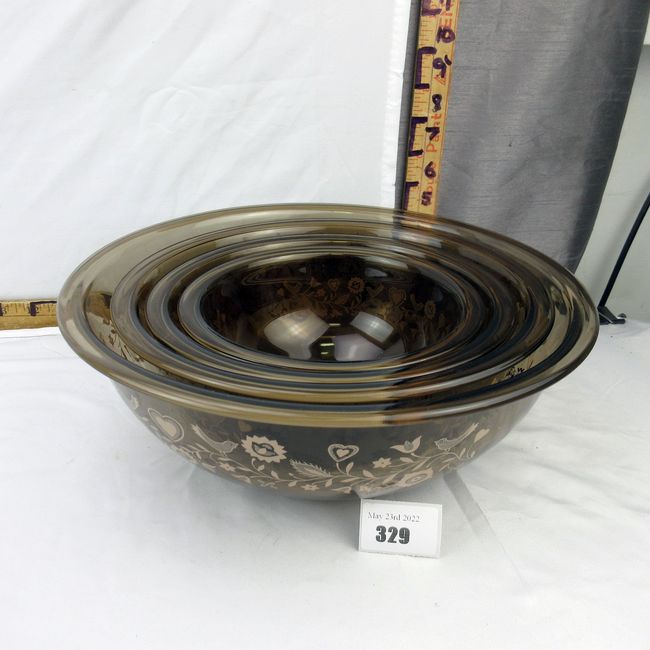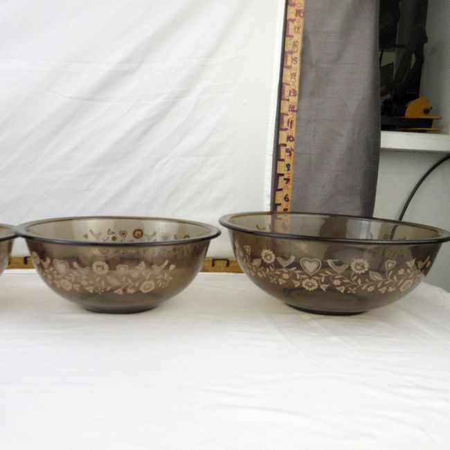 Current Bid: $32.22 [Refresh Price]YOU WILL NEED TO REFRESH THIS PAGE TO SEE UPDATED BID (Log in and this will update automatically) You must LOG IN or REGISTER to see this full page auction listing and bid. Auction is Over Winning Bid Amount: $32.22 **Lot Details: (329h) - A vintage Pyrex pink festive harvest patterned amber/smokey glass nesting bowl set. All four bowls are in very good, clean condition. Pink birds, flowers and hearts. These have definitely never seen a dishwasher, possibly never used at all. Log in to add this lot to your watch list or place a bid |