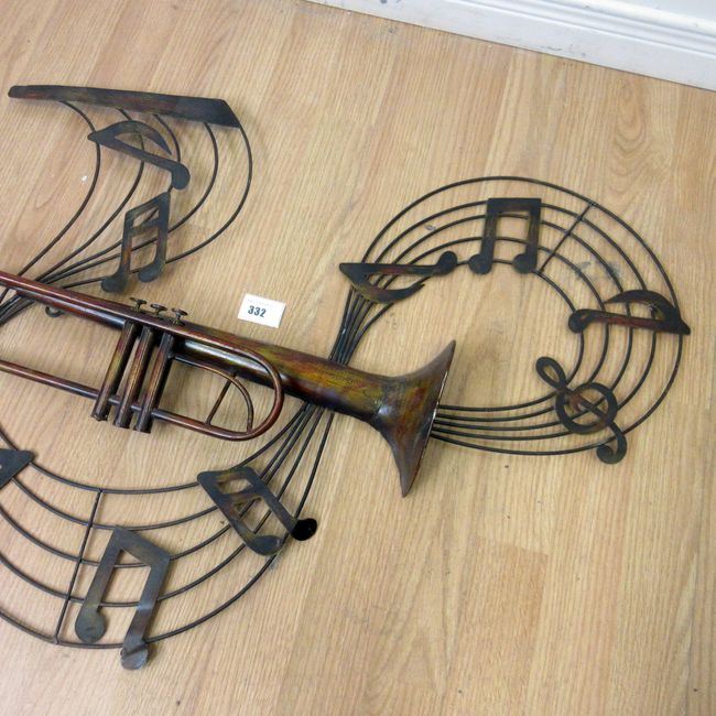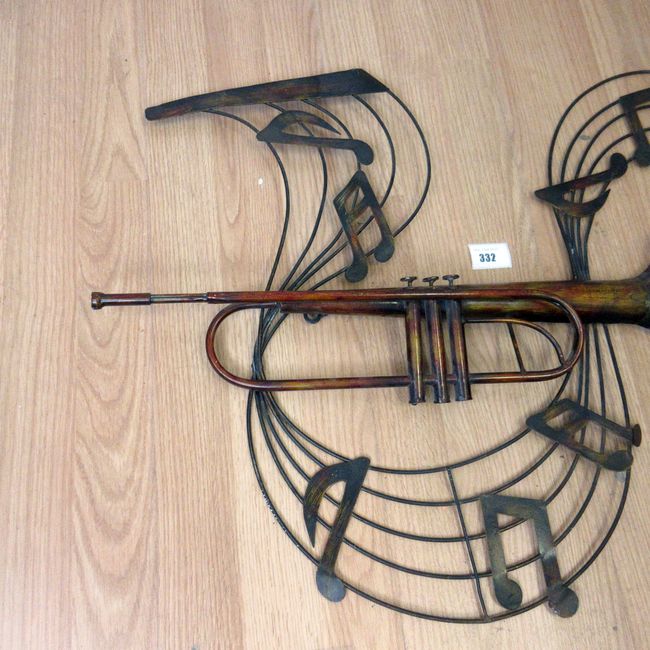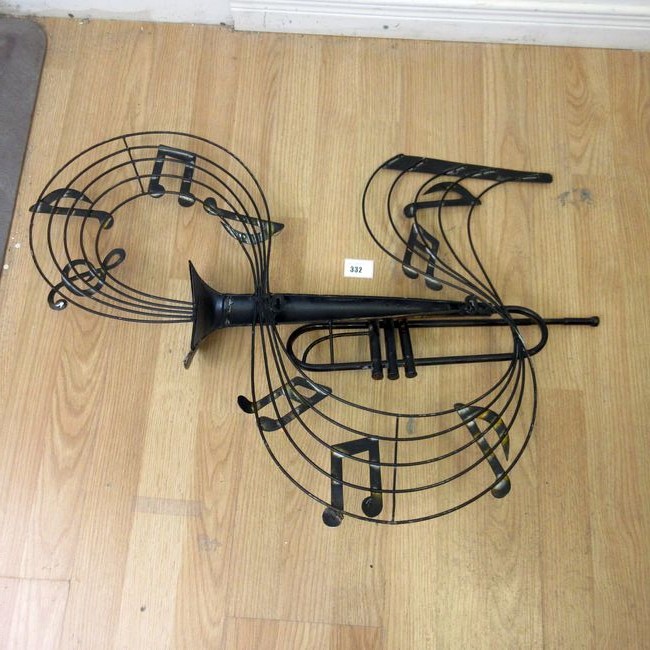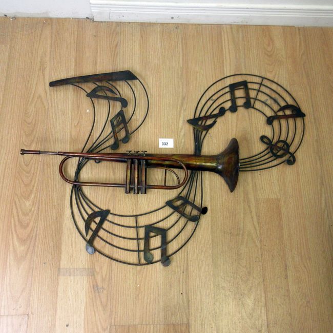 Current Bid: $23.00 [Refresh Price]YOU WILL NEED TO REFRESH THIS PAGE TO SEE UPDATED BID (Log in and this will update automatically) You must LOG IN or REGISTER to see this full page auction listing and bid. Auction is Over Winning Bid Amount: $23.00 **Lot Details: (332h) - A great looking metal music themed wall sculpture/hanging with a three dimensional trumpet and music notes. Approximately 32” wide. Log in to add this lot to your watch list or place a bid |