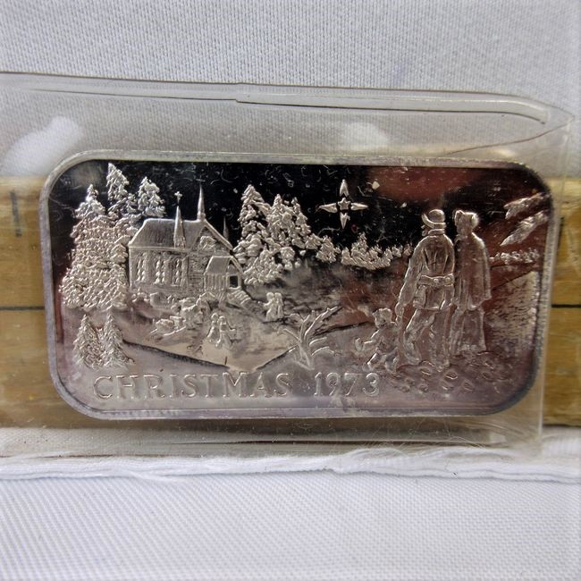 Current Bid: $78.00 [Refresh Price]YOU WILL NEED TO REFRESH THIS PAGE TO SEE UPDATED BID (Log in and this will update automatically) You must LOG IN or REGISTER to see this full page auction listing and bid. Auction is Over Winning Bid Amount: $78.00 **Lot Details: (350h) - Christmas 1973, .999 Pure Silver bar Log in to add this lot to your watch list or place a bid |