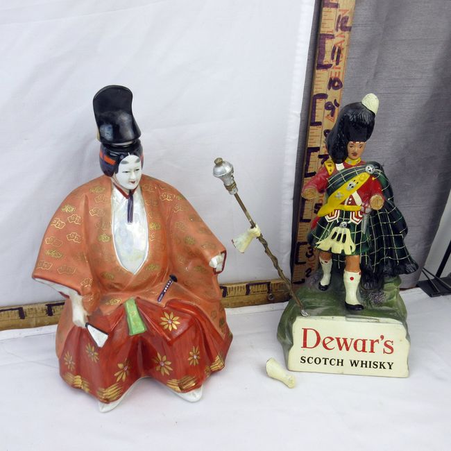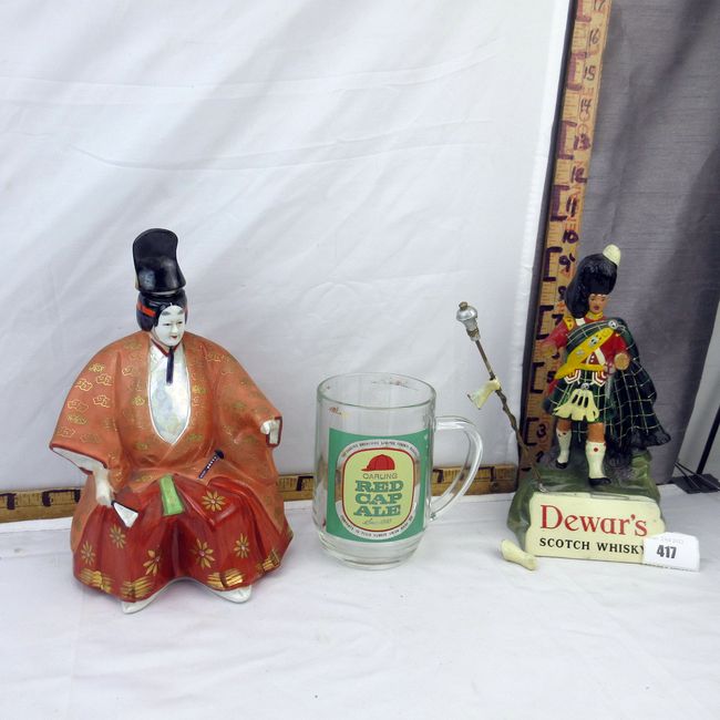 Current Bid: $5.00 [Refresh Price]YOU WILL NEED TO REFRESH THIS PAGE TO SEE UPDATED BID (Log in and this will update automatically) You must LOG IN or REGISTER to see this full page auction listing and bid. Auction is Over Winning Bid Amount: $5.00 **Lot Details: (417h) - 2 liquor decanters and a Red Cap Ale mug. Hand is broken on the Dewar's Whiskey decanter, so this is an AS IS lot. Super bar collectibles. Log in to add this lot to your watch list or place a bid |