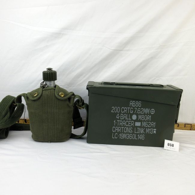 Current Bid: $21.00 [Refresh Price]YOU WILL NEED TO REFRESH THIS PAGE TO SEE UPDATED BID (Log in and this will update automatically) You must LOG IN or REGISTER to see this full page auction listing and bid. Auction is Over Winning Bid Amount: $21.00 **Lot Details: (58i) - Military ammo box 11" x 3 1/2", handle and open/close latch. View markings. Early canteen in fabric pouch. Straps and snaps. Both in excellent condition Log in to add this lot to your watch list or place a bid |