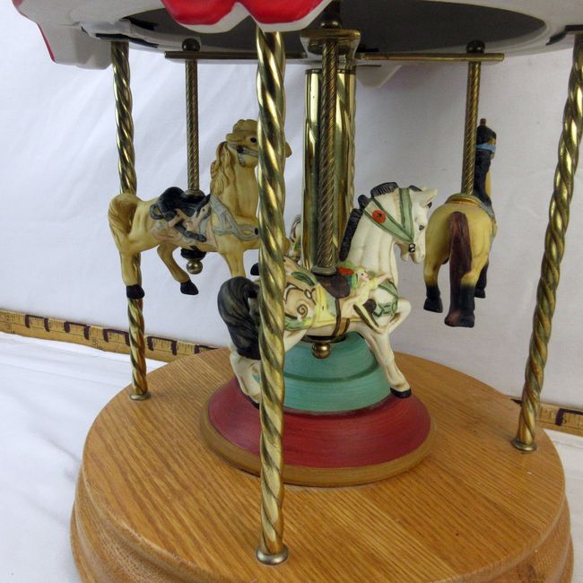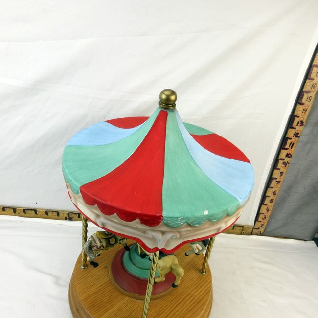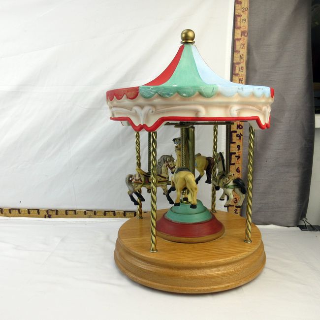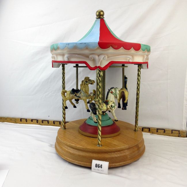Current Bid: $19.00 [Refresh Price]YOU WILL NEED TO REFRESH THIS PAGE TO SEE UPDATED BID (Log in and this will update automatically) You must LOG IN or REGISTER to see this full page auction listing and bid. Auction is Over Winning Bid Amount: $19.00 **Lot Details: (64i) - Vintage large Willets porcelain carousel. Musical, brass posts, 4 horses matted porcelain, wood base. Bought at Birks Jewelry Toronto 1972. Small chip on big top and slight scuffs in one area. 16"H x 11" base. Matted porcelain big top Log in to add this lot to your watch list or place a bid |