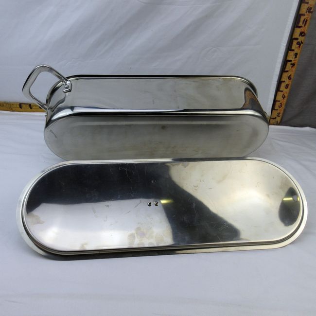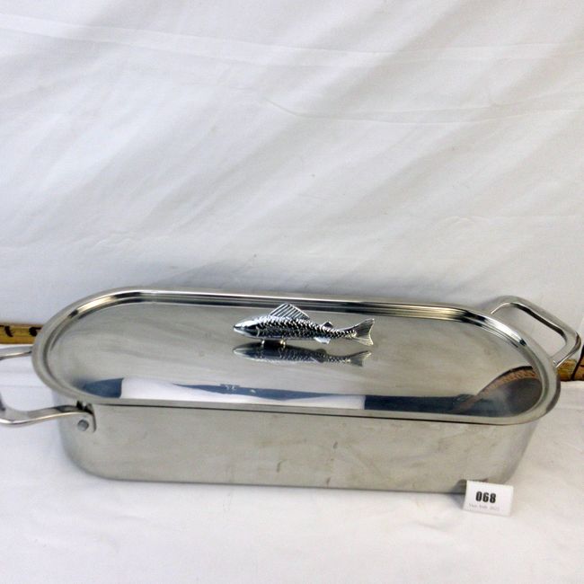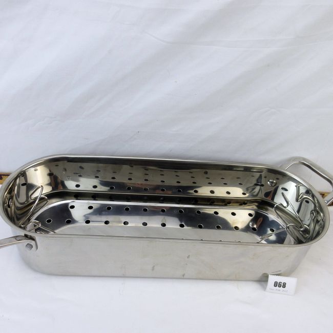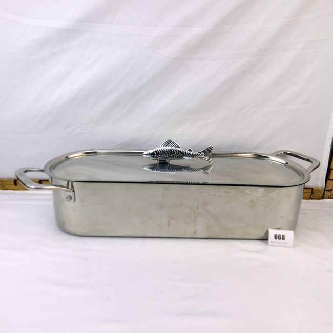 Current Bid: $17.00 [Refresh Price]YOU WILL NEED TO REFRESH THIS PAGE TO SEE UPDATED BID (Log in and this will update automatically) You must LOG IN or REGISTER to see this full page auction listing and bid. Auction is Over Winning Bid Amount: $17.00 **Lot Details: (68i) - Never used unusual Poacher w Fish Top Handle thick off side angled Handles w a raised handled strainer, very well made, oven to table with this unique stainless steel design ! Log in to add this lot to your watch list or place a bid |